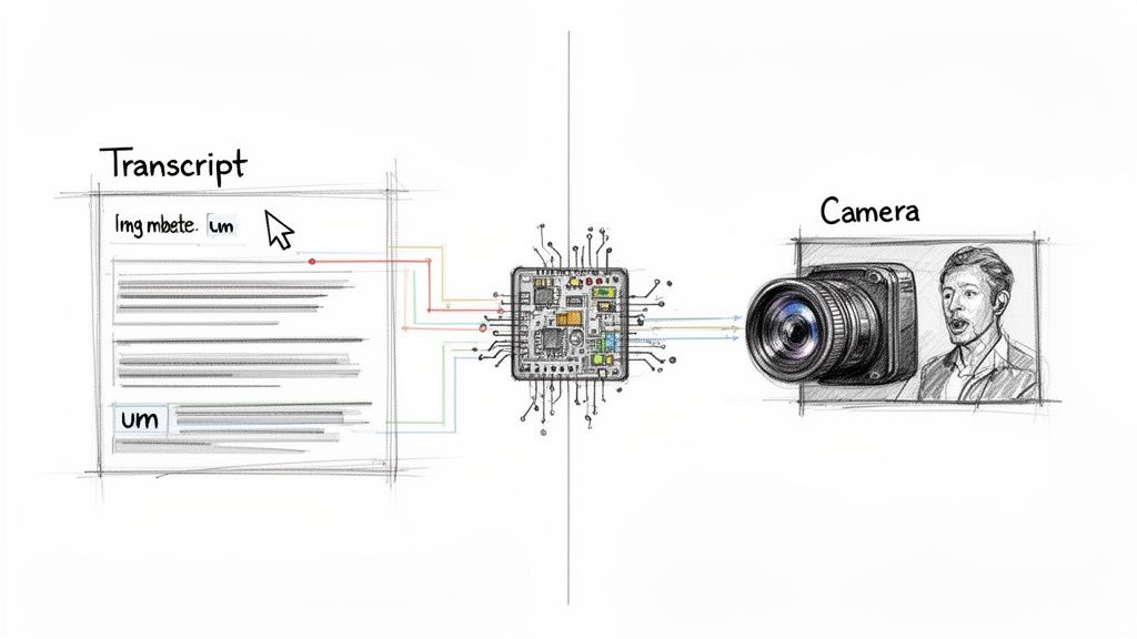 That transcript becomes your new editing playground. Instead of scrubbing through audio waveforms to find that one awkward pause or filler word, you just scan the text.